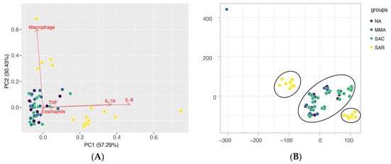 Additionally, cluster analysis of the different groups based on the profile of sputum cellularity and productions of cytokines and chemokines shows distinctive groupings for SAR patients in comparison to all other studied groups (SAC, MMA, NA), either by principal component analysis (PCA) or t-distributed stochastic neighbor embedding (t-SNE), (Figure 2A,B respectively). A high production of pro-inflammatory cytokines in the sputum seems to be a unifying characteristic of the individuals in the SAR phenotype, whereas the proportions of predominant cell types (eosinophils or macrophages) is an important component contributing to differentiation within the group (Figure 2A). The observed grouping of individuals in the SAC and MMA asthma types with individuals in the NA group might be partially explained by the control of the inflammatory response and symptoms with corticosteroids (Figure 2A,B).