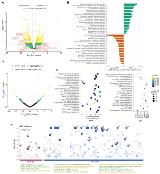 Transcriptomics and shotgun proteomics of induced sputum. (A) Volcano plot presents the differently expressed genes from libraries of individuals with treatment-resistant severe asthma (SAR = 2 samples) and mild-to-moderate asthma (MMA = 2 samples). (B) Gene-set enrichment analysis between the SAR (in green) and MMA (in orange) groups based on KEGG pathways. (C) Volcano plot of the miRNAs expressed between the two groups of asthmatics (Table S4 for details). Highlighted in yellow are miRNAs differentially expressed with statistical significance. (D) Gene-set enrichment analysis of genes regulated by the miRNAs differently expressed among asthma phenotypes. The number of cells in process (log 2) is represented by the size of the dot, and the significance (p-value) is represented by color intensity. (E) Enrichment of the cascades (KEEG and Reactome) presents the genes identified in the induced sputum proteome (represented in circles). Circles with green labels, cascade of genes most expressed in MMA in relation to the severe asthma (SA) group. In orange, the cascades with the highest gene expression in SA in comparison to MMA (padj: adjusted enrichment p-values in negative log10 scale). The y-axis shows the adjusted enrichment p-values in negative log10 scale. Groups—SAR: treatment-resistant severe asthma; MMA: mild-to-moderate asthma.