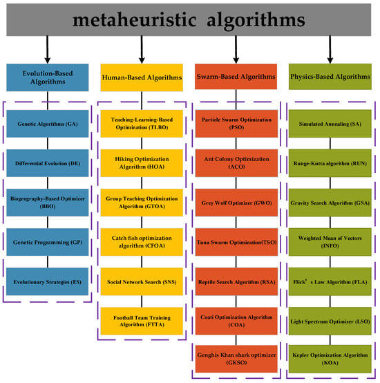 Metaheuristic algorithms are divided into four categories depending on the source of inspiration []: evolution-based, human-based, swarm-based, and physical-based algorithms, as illustrated in Figure 1. Evolution-based algorithms draw inspiration from selection and genetic mechanisms in nature. Genetic Algorithms (GAs) [] and Differential Evolution (DE) [] are typical of this category, and the rest include the Biogeography-Based Optimizer (BBO) [], Genetic Programming (GP) [], and Evolutionary Strategies (ES) []. Human-based algorithms are inspired by human behavior. Teaching–Learning-Based Optimization (TLBO) is inspired by the classroom teaching process and iteratively improves the quality of the solution by simulating the interaction between the teacher and the students []. Oladejo et al. proposed a Hiking Optimization Algorithm (HOA) inspired by human hiking []. Other human-based algorithms include Group Teaching Optimization Algorithm (GTOA) [], Catch Fish Optimization Algorithm (CFOA) [], Social Network Search (SNS) [], and Football Team Training Algorithm (FTTA) []. Swarm-based algorithms are inspired by the behavior of groups of various types of organisms. Particle Swarm Optimization (PSO) is one of the most classical algorithms inspired by the behavior of bird flocks []. Colorni et al. introduced the Ant Colony Optimization (ACO) algorithm [], inspired by the path selection behavior of ants. The Grey Wolf Optimizer (GWO) [] is a method proposed by Mirjalili et al. inspired by the strict social hierarchy and hunting behavior of grey wolves. Xie et al. proposed Tuna Swarm Optimization (TSO) inspired by the spiral and parabolic foraging methods of tuna []. Abualigah et al. proposed the Reptile Search Algorithm (RSA) by crocodile hunting behavior []. More swarm-based algorithms are the Coati Optimization Algorithm (COA) [], Dwarf Mongoose Optimization (DMO) [], Spider Wasp Optimizer (SWO) [], Remora Optimization Algorithm (ROA) [], Genghis Khan Shark Optimizer (GKSO), [], etc. Physics-based algorithms are proposed by mimicking physicochemical phenomena and laws. Simulated Annealing (SA) [] is the most famous physics-based algorithm, inspired by the annealing phenomenon of molten metal in metallurgy. The Runge–Kutta algorithm is the optimization based on a mathematical principle that utilizes the Runge–Kutta’s fourth-order principle to estimate optimal solutions without the use of derivatives []. The Gravity Search Algorithm (GSA) [] is proposed by being inspired by the law of gravity. Others include [] the Weighted Mean of Vectors (INFO) [], Flick’s Law Algorithm (FLA) [], Light Spectrum Optimizer (LSO) [], PID-based Search Algorithm (PSA) [], and Kepler Optimization Algorithm (KOA) [].