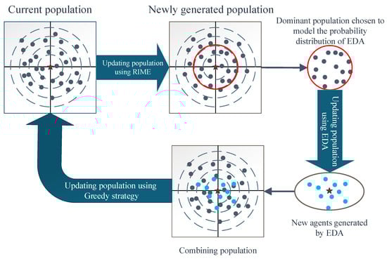 where represents the weighted mean value of the dominant population. denotes the weight coefficients, arranged in descending order according to the fitness value in the dominant population. is the weighted covariance matrix of the dominant population. is a uniformly distributed random number. The EDA mainly chooses a high-quality solution to construct a probability distribution model; thus, it easily extracts the descending direction of the fitness value. However, the distribution model is overfitted in the later stage of iterations, resulting in a reduced population diversity and falling into local optima. Therefore, HERIME mainly employs the exploration ability of the EDA and embeds it into the RIME using synergistic fusion framework.