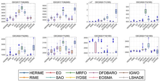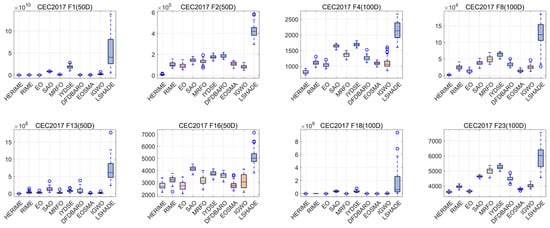 The convergence curves and boxplots of HERIME and other competitors based on CEC2017 (50D).