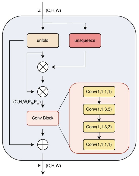 The dimension of Z is . Initially, an unfold operation is performed on Z, transforming the feature map Z into a series of blocks containing information of local regions, and reshaping these blocks into tensors with specified kernel sizes. Subsequently, these tensors undergo Hadamard product operations with the original feature map Z to obtain preliminary local self-correlational features L. The implementation of L can be specifically represented as Equation (1). Upon obtaining L, a second Hadamard product operation is conducted between L and the unfolded tensor to further obtain Enhanced Self-Correlational features E. The specific implementation of E can be represented as Equation (2).
