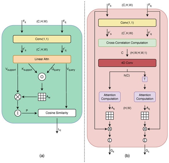 In the computation of attention, acts as the temperature coefficient, controlling the sensitivity of the matching scores, where x denotes specific positions within the feature maps. represents the matching score between a position in the support and a position in the query. Thus, the expression for the average matching probability between a specific position on the support image and the corresponding position on the query image is denoted as . The cross-attention for the query image, , can be calculated in a similar manner. Upon obtaining and , these attentions are fused with the original features and to yield the joint cross-attention maps and .
