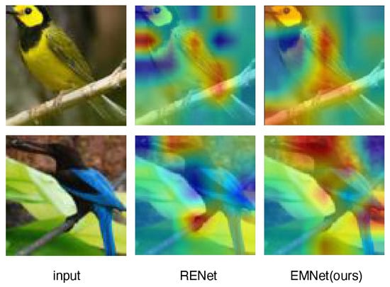 The attentional effects result of EMNet is shown in Figure 6. In comparison to RENet, EMNet demonstrates higher performance in generating attention maps. EMNet exhibits more focused attention on crucial areas, such as the bird’s head and back, with higher activation values. This allows for more accurate capture of essential image features. EMNet also shows improved detail in feature extraction, with clearer and more intense activation in key regions.