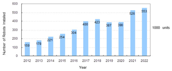 Since 2017, the robotics industry has experienced rapid growth, with an increasing deployment of robots in practical applications. According to the International Federation of Robotics (IFR) World Robotics 2023 Report, the global sales of industrial robots reached 553,052 units in 2022, representing a 5% increase compared with 2021 and setting a new record (Figure 1). From 2017 to 2022, the compound annual growth rate (CAGR) of global industrial robot sales was approximately 7% [1]. However, it is worth noting that the global COVID-19 pandemic during this period significantly disrupted global supply chains and industrial production. Despite these challenges, the robotics industry demonstrated resilience, with a notable recovery in demand post-2021 as industries accelerated automation efforts to address labor shortages and enhance operational efficiency. These trends highlight the field’s significant potential and the swift integration of robotics technology across various industries, driving global industrial development. The extensive use of industrial robots has improved manufacturing efficiency, enhanced product quality, reduced costs, and fostered the advancement of smart manufacturing and automation, thus creating new avenues for economic growth. These indicators suggest that the robotics industry will continue to expand rapidly, driven by ongoing technological innovation and the broadening of application boundaries.