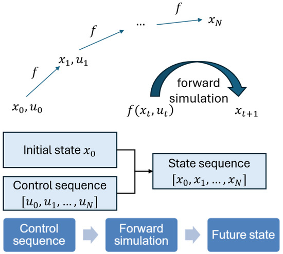 The single shooting method involves rolling out the system’s dynamics by sequentially applying control inputs, starting from an initial state. This method can be mathematically represented as follows: