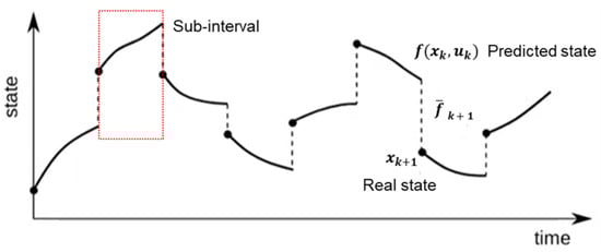 In the prediction step, the future state of the system is predicted based on its model and control sequence. The system evolves from its discrete-time dynamics:
