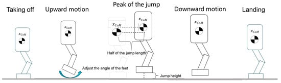 In contrast, model predictive control (MPC) leverages CPU-based parallel computation and operates within defined physical constraints, making it particularly efficient for real-time tasks [9]. Unlike DRL, which requires pretraining, MPC performs iterative optimization during runtime, allowing for quick adjustments to control parameters without the need for retraining. This makes MPC highly suitable for tasks involving dynamic changes in CoM height, such as jumping, where rapid feedback and low-latency responses are critical. Each optimization cycle in MPC typically requires only 10–15 milliseconds, ensuring real-time applicability even in dynamically changing conditions. The structured approach of MPC also ensures better handling of tasks with well-defined objectives, such as transitioning between walking and jumping, further demonstrating its adaptability to bipedal robot locomotion challenges.