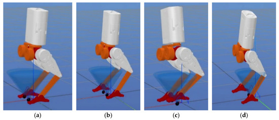 Python environment: (a) the robot in a stationary standing position; (b) the robot taking a step with its right foot as the first step; (c) the robot taking a step with its left foot as the second step; (d) the robot taking a step with its right foot as the third step.