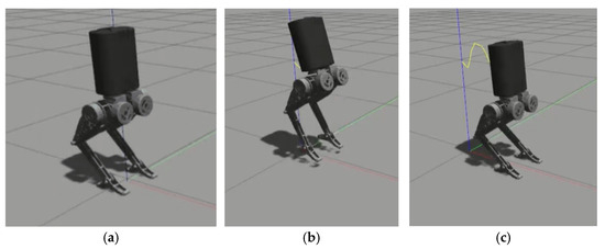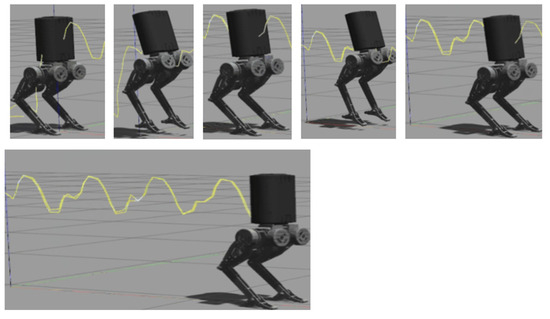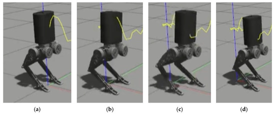 In Figure 10, the red line represents the X-axis, the green line represents the Y-axis, the blue line represents the Z-axis, and the yellow line indicates the trajectory of the robot’s center of mass.
