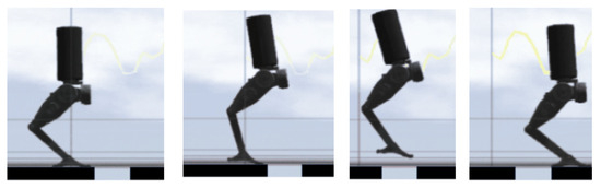 In the low-friction environment, the robot successfully performed continuous jumping simulations. The robot was able to execute multiple jumps, recover stability after each jump, and proceed to the next jump without any issues. Figure 15 illustrates this process, showcasing the robot’s ability to maintain stability and execute smooth transitions between consecutive jumps on a slippery surface.