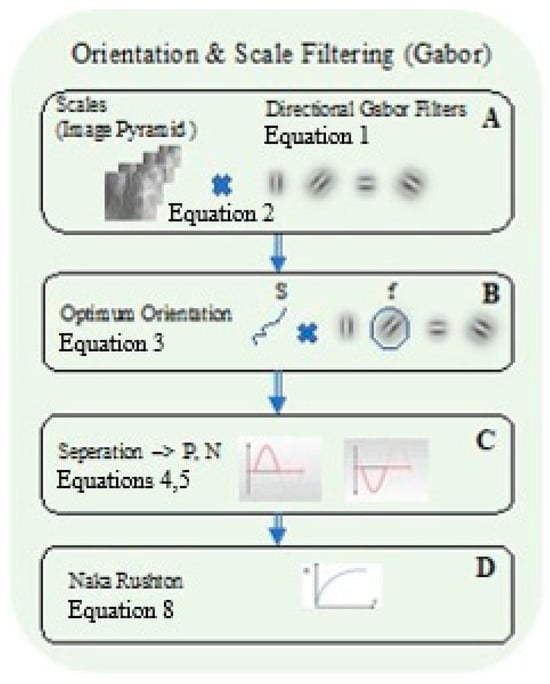 Schematic block diagram of the initial part of the algorithm that computes the different Gabor receptive fields of orientations and spatial resolutions. (A) Direclioral Gabor Filters. (B) The optimal orientation and scale filters are then computed. (C) The negative and positive components are separated. The small plots on the right and left sides illustrate the mathematical operations. (D) The Naka–Rushton operation.