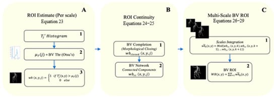 Up to this stage, each ROI candidate (Equations (24)–(26)) was considered separately for each image scale, whereas the final ROI must include all the scales. The final stage of the ROI BV algorithm (Figure 4C), consequently, provides weighs function information (Figure 4C1; Equations (27) and (28)) from the different binary image scales , to enable the integration of various BV scales in a later stage (Figure 4C2, Equation (29)).