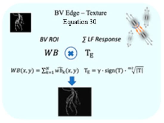 The output of the enhanced edges, (the line completion responses) in the image (Figure 3C, Equation (23)) can be referred, in this stage of the algorithm, only to the labeled ROI (Figure 4C2, Equation (30)). Therefore, (Equation (30) and Figure 5) is calculated to delineate the spatial location in which the line completion is applied.