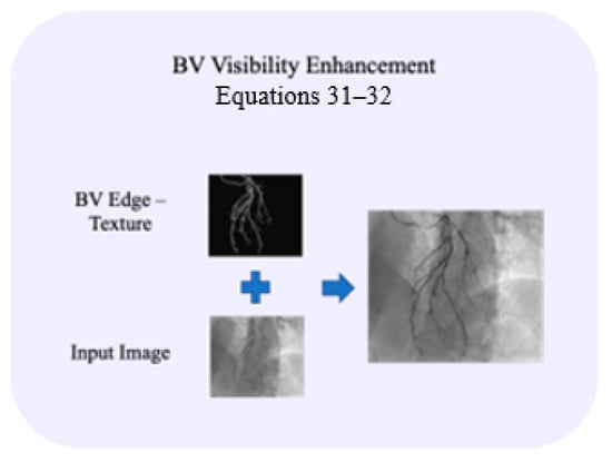 Few computational algorithms have been developed to reduce the amount of toxic X-ray radiation and contrast agent dose while minimizing image quality degradation [,,]. For enhancing the visibility at low doses, different methods have been used, such as decreasing the noise through principal component analysis (PCA) [], adding the isolated vessel layer to the low-dose image [], and using a convolutional neural network (CNN) algorithm []. Exposure of additional BVs under the condition of low contrast was shown by using fractional differential kernels [] and additional classical methods, such as Hessian-based methods [] or lateral inhibition-based models.