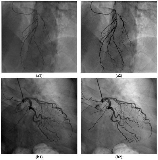 Two examples of VIAEVCA results (a2,b2), which represent the better overall appearance of an angiogram with a better view of the BVs, including of the small ones. Original (“raw”) images are shown on the left column and the algorithm results on the right column. This mode of presentation of the image results refers to all the figures in this study. (a1,b1) are the original images before the algorithm’s applications.