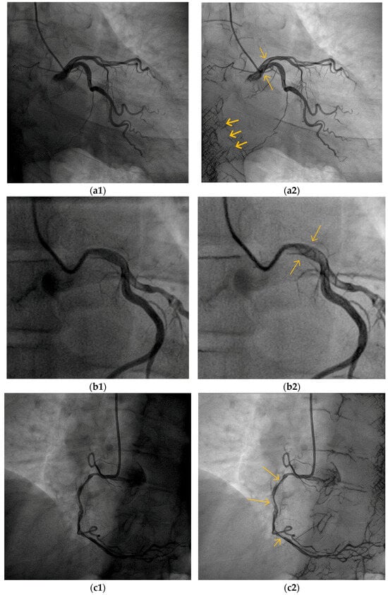 The VIAEVCA succeeds in increasing the visibility of the interior content of the BVs while revealing important clinical details. (a2) The upper long arrow indicates the exposure of the catheter tip, while the upper short arrow indicates exposure of the inner lumen of the left main coronary artery. The spine artifacts are exposed and are indicated by the thick left arrows. (b2) The BV shows overlapping vessels and lesions (see text); see the long arrows. (c2) Two dissections of the right coronary artery (long arrows) are exposed. The wire is also more visible (short arrow) with the results image. (a1,b1,c1) are the original images before the algorithm’s applications.