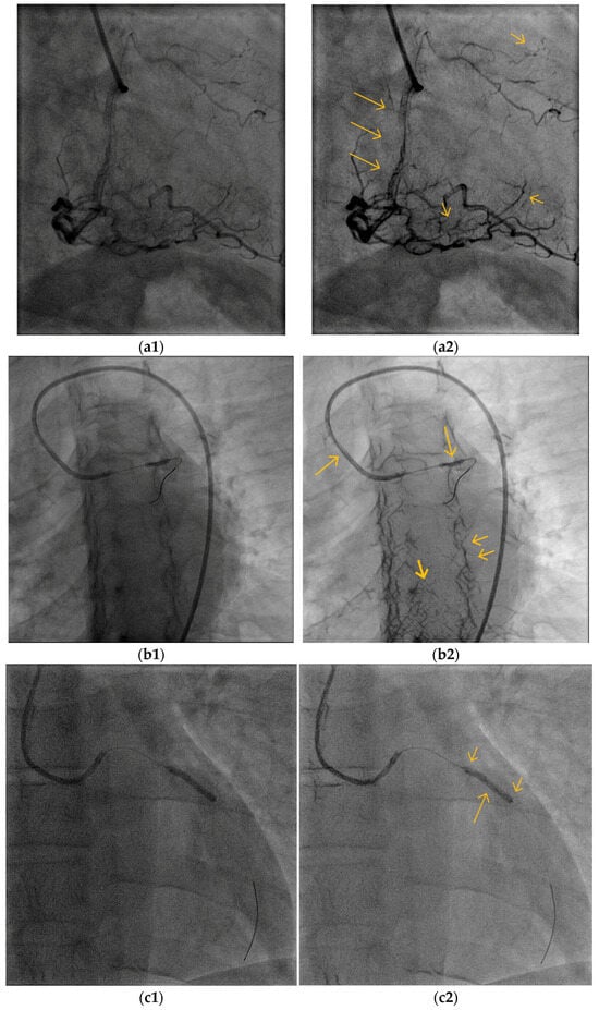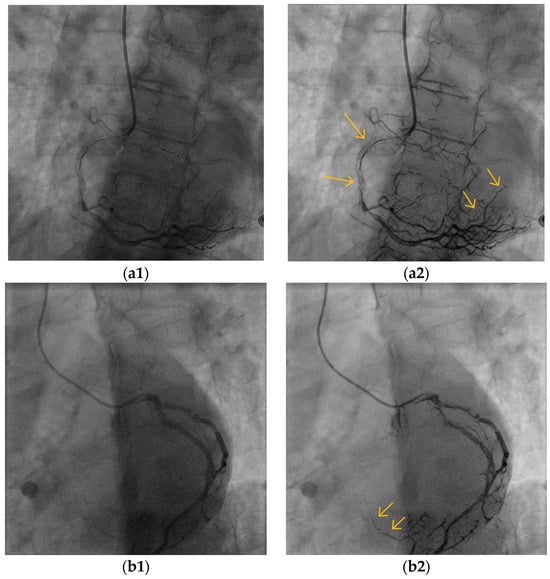 The VIAEVCA enables the better appearance of the small and clinically important blood vessels. (a2) The right arrows show better visibility of the small BVs, which split and climb upwards. Their diagnostic significance is described in the text. The left arrows show the two stents. (b2) The arrows show the exposed right coronary artery (see text for clinical significance). (a1,b1) are the original images before the algorithm’s applications.