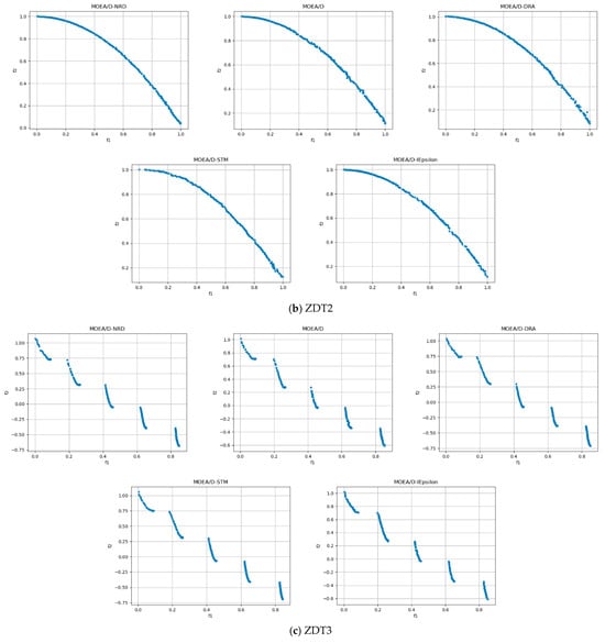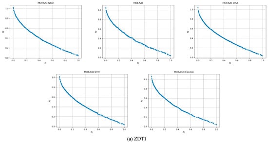 From Figure 6’s box plots, MOEA/D-NRD achieves the best IGD values on ZDT2 and ZDT4. MOEA/D-NRD demonstrates good stability across most of the test problems, with its performance being particularly outstanding on the ZDT2 problem. MOEA/D shows moderate performance. While MOEA/D-DRA excels on certain problems (such as ZDT3), it exhibits significant fluctuations on more complex problems (like ZDT4). Although MOEA/D-STM may achieve good optimal solutions, it has the poorest overall stability and frequently produces outliers. MOEA/D-IEpsilon, on the other hand, shows a level of stability and performance that is close to that of MOEA/D-NRD.