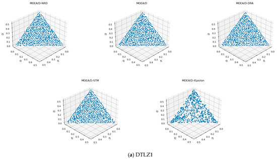 Across all DTLZ test sets, MOEA/D-NRD achieves the best mean HV values only for DTLZ1 and DTLZ3. In the other test sets, MOEA/D-NRD’s box plots are wider, indicating less stability in HV. Compared to other MOEA/D variants, there is still room for improvement in maintaining population diversity with MOEA/D-NRD.