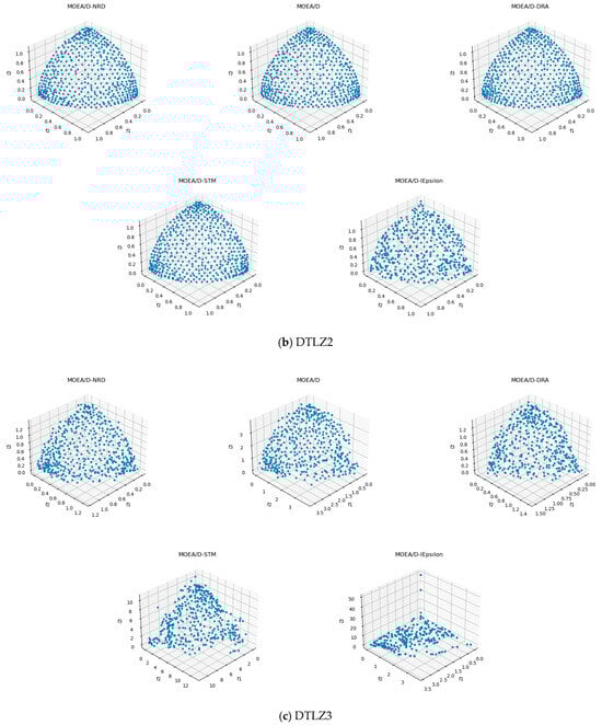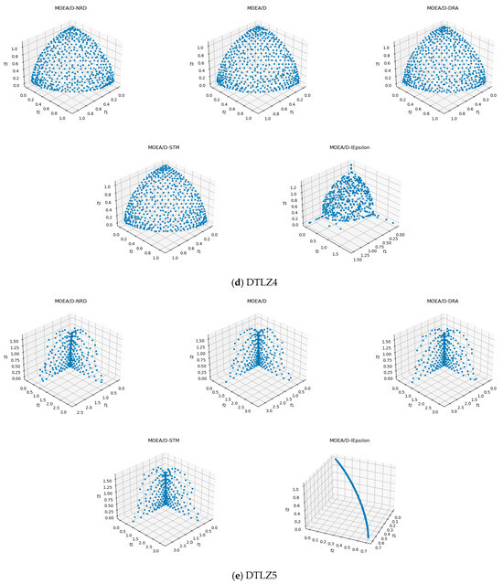 In the DTLZ1, DTLZ2, and DTLZ4 test sets, MOEA/D-NRD, MOEA/D, MOEA/D-DRA, and MOEA/D-STM all exhibit good convergence, distribution, and solution-set diversity, effectively approaching the Pareto front. However, the MOEA/D-IEpsilon algorithm performs relatively poorly in these test sets, with poor diversity in the solution set, especially showing sparser density in certain regions.