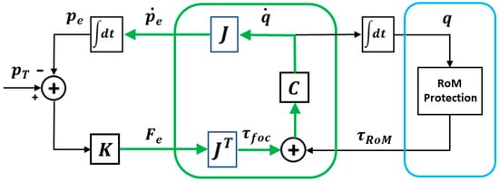 In the overall kinematic chain, the Jacobian matrix allows us to map an incremental variation of the joint rotation vector into the corresponding variation of the position/orientation vector of the end-effector : . This mapping expresses the well-posed direct kinematic transformation of the kinematic chain, whatever its degree of redundancy. Inverting this transformation is generally a difficult, ill-posed problem [], particularly in the case of hyper-redundant robots [,]: unlike forward kinematics, inverse kinematics cannot be solved in a closed-form expression, providing a unique solution. Moreover, straight inverse kinematic methods cannot be easily extended to integrate complementary computational tasks, in addition to the pure kinematic task, as the satisfaction of the joint limits and the tasks related to the physical interaction with the manipulated objects is based on the modulation of the compliance of the end-effector. In particular, joint limits avoidance is a classical and crucial issue in robot control whose solution is typically based on the exploitation of kinematic redundancy, using optimization or iterative algorithms [,] whose complexity grows with redundancy, with a corresponding decrease in robustness.