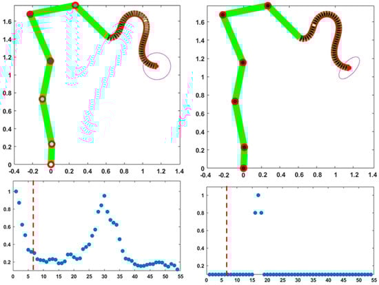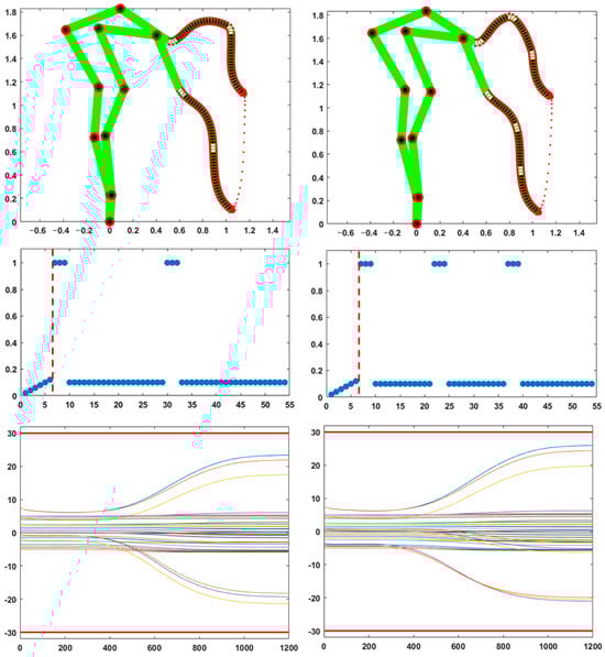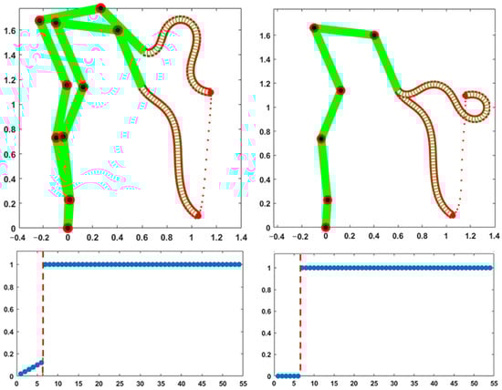 Figure 4 is focused on another crucial aspect associated with the modulation of the compliance vector, namely the simulation of pseudo-joints during the coordination of the hyper-redundant DoFs of the trunk in order to transform the hydrostat into a virtually articulated kinematic structure with a desired number of pseudo-joints and a desired length of the corresponding links. The left part of the figure illustrates the configuration of a two-DoF pseudo-articulated hydrostat and the right part the analogous configuration of a three-DoF structure. As shown in the graphs in the second row of the figure, this result is implicitly obtained by setting to one the hydrostat modules that correspond to the desired pseudo-joints and by freezing all the other modules, i.e., setting to a very low level the elements of the compliance vector. However, we should consider that, for a given trajectory of the trunk tip, the required rotation of the pseudo-joints might exceed the allowed RoM, in spite of the fact that the RoM protection component of the PMP model operates in order to avoid this danger. An additional option, to further reduce this danger, is to extend the “width” of the pseudo-joints, for example, from one to three elements, as illustrated in the graphs in the second row of the figure. The graphs in the third row show that this result is obtained by constraining all the DoFs inside the RoM. It is also worth comparing these graphs with the graphs in the middle row of Figure 3, which correspond to the same motion of the end-effector but with a totally compliant hydrostatic segment. This demonstrates that, although the choice of modulating the distribution of values in the compliance vector in order to simulate two or three pseudo-joints of the trunk increases the risk of overcoming the RoM of the hydrostatic structure, the extension of the width of the pseudo-joints, together with the RoM protection module, provides a simple and robust computational solution.