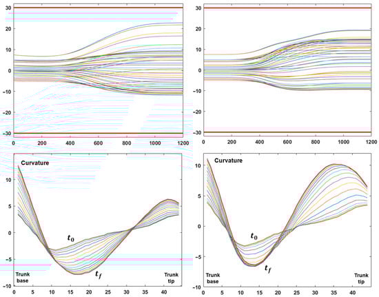 The left/right parts of the figure refer to the gesture of the left/right parts of Figure 2. For each column, the top graph shows the time course of the 48 DoFs of the trunk; the measurement units are ms for the time axis and deg, for the vertical axis; the two red horizontal lines identify the RoM of the trunk DoFs (±30 deg). The bottom graphs show the evolution of the trunk curvature profile (measurement unit m−1, from the trunk base to the trunk tip) during the corresponding gesture, from the initial to the final instant of the movement.