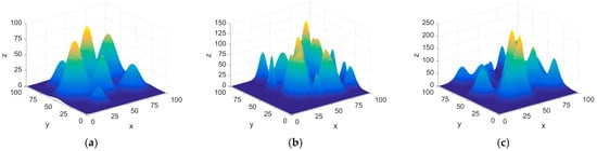 In this model, (xi, yi) represents the center coordinates of the i-th peak, hi is the terrain parameter controlling the height of the peak, and sxi and syi are the attenuation values along the x-axis and y-axis for the i-th peak, respectively, controlling the slope of the mountain. N denotes the total number of peaks in the mountainous environment. To comprehensively assess UAV performance across various natural terrains, this study utilizes three different environmental models featuring 10, 20, and 30 peaks, as illustrated in Figure 1.