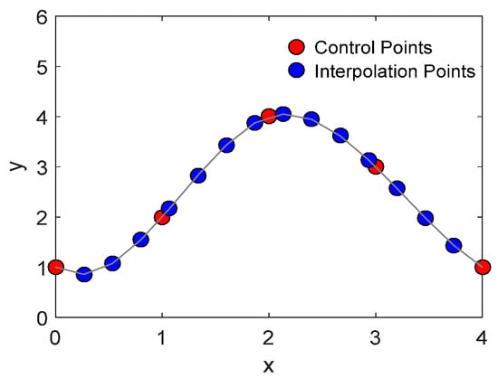 The generation of a UAV’s flight trajectory involves determining an ordered set of point coordinates, referred to as control points, which serve as the foundation for the UAV’s spatial movements. These control points define the shape of the flight path and are essential for path optimization. By applying cubic uniform B-spline curve interpolation to these control points, it is possible to flexibly adjust the curve shape between them, thus generating a smooth and continuous flight trajectory, as illustrated in Figure 2.