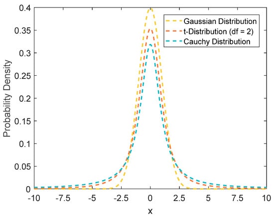 The t-distribution, commonly referred to as Student’s t-distribution, is a probability distribution dependent upon the degrees of freedom parameter n. The value of n directly influences the shape of the t-distribution curve: a smaller n results in a flatter curve, whereas a larger n produces a steeper curve. As n→∞, the t-distribution approaches the standard Gaussian distribution N(0,1); conversely, when n = 1, it degenerates into the standard Cauchy distribution C(0,1). Therefore, the standard Gaussian and Cauchy distributions are two boundary special cases of the t-distribution. The probability density functions of these distributions are illustrated in Figure 4.