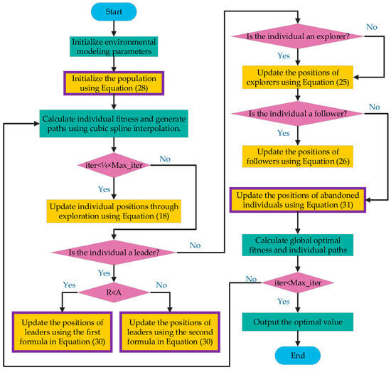 The algorithm flowchart is shown in Figure 5, and the part introducing strategies into the IHEOA has been highlighted in purple in the flowchart.