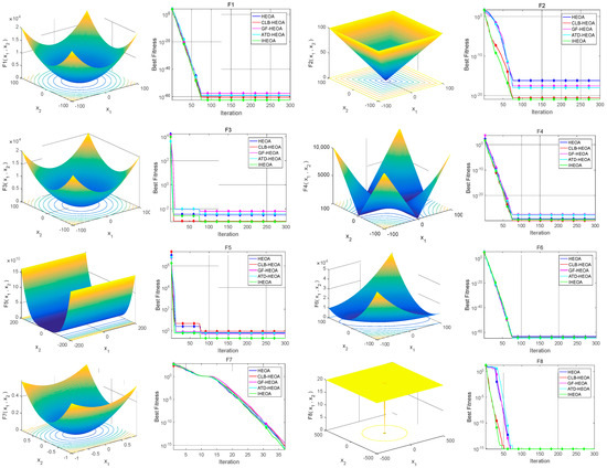 Notably, the IHEOA excels across nearly all test functions, with its maximum, minimum, mean, and standard deviation outperforming the other algorithms, highlighting the significant advantages of strategy integration. For instance, in function F1, the IHEOA attains a minimum value of 3.3071 × 10−63 and a mean of 1.1365 × 10−50, which illustrates its exceptional optimization performance and stability. By integrating multiple strategies, the IHEOA effectively capitalizes on the strengths of each strategy, resulting in significant performance enhancements and demonstrating stronger global search capabilities and higher convergence precision.