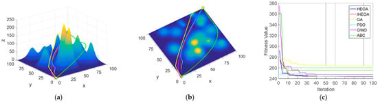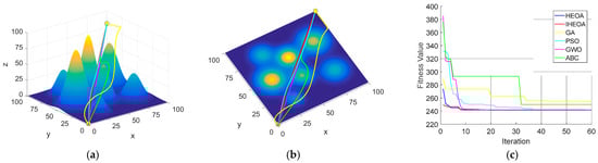 The 10-peak environmental model, which presents relatively low planning difficulty, serves as an appropriate benchmark for assessing the global optimization capabilities of the algorithm. Under the condition of 60 iterations, all the algorithms successfully generated valid paths. However, the IHEOA attained the lowest optimal fitness, with its average fitness reduced by 10.5%, 0.5%, 1.2%, 14.7%, and 0.4% compared to the GA, PSO, GWO, ABC, and HEOA, respectively. As shown in Figure 7, the path generated by the IHEOA is smoother with fewer inflection points and demonstrates faster convergence.