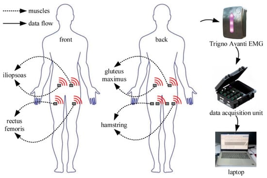 The hardware and data flow in the sEMG collection experiments. There is one sEMG electrode on each iliopsoas, rectus femoris, and gluteus maximus and two sEMG electrodes on each hamstring.
