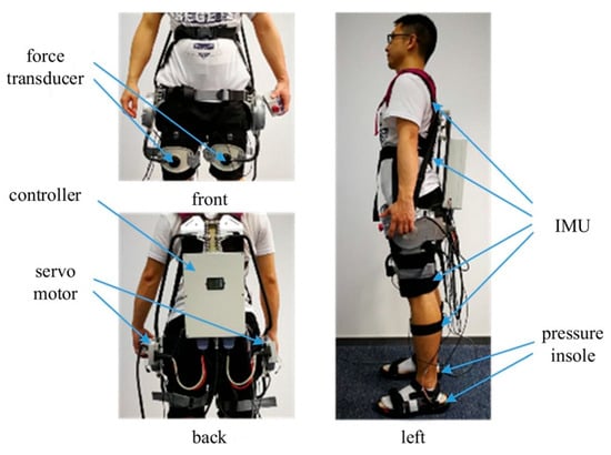 The net weight of the exoskeleton was 10 kg. Six IMUs were attached to the subject’s chest, pelvis, thighs, and shanks to recognize human body gestures. Two pressure insoles were also used to detect HS and TO in real time. There were two force transducers that connect the exoskeleton’s thigh brace with the wearer’s thigh. The transducers were used to calculate and give feedback on human–machine interaction torques for the real-time regulation of assistance torques.