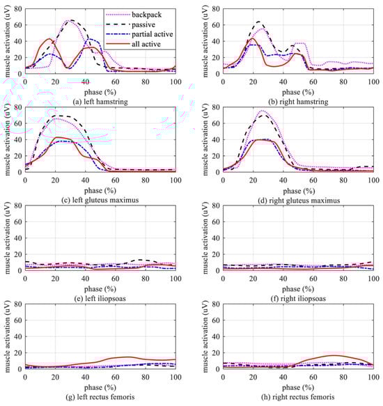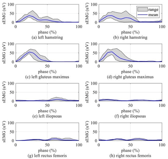 sEMG of left and right hip extensor/flexor muscles. (a) sEMG of the left hamstring. (b) sEMG of the right hamstring. (c) sEMG of the left gluteus maximus. (d) sEMG of the right gluteus maximus. (e) sEMG of the left iliopsoas. (f) sEMG of the right iliopsoas. (g) sEMG of the left rectus femoris. (h) sEMG of the right rectus femoris.