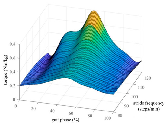 Normalized hip torque surface for 2D-LUT. Normalized hip torque can be obtained according to the gait phase and stride frequency.
