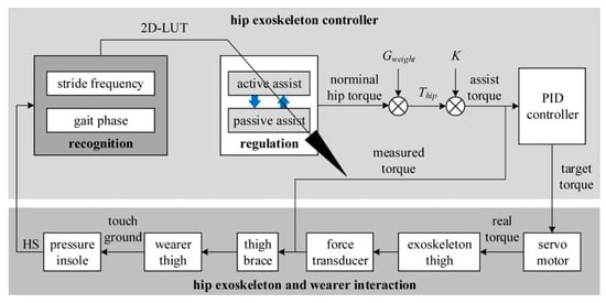 Exoskeleton control framework: An exoskeleton control framework for regulating the exoskeleton’s assistance timing is proposed in this article, as shown in Figure 7. The exoskeleton control framework consists of three modules: (1) Real-time recognition of the wearer’s ωn and φn to estimate the wearer’s hip torque; (2) regulation of active assist and passive assist switching; (3) PID control of the exoskeleton’s joint servo motor. The real-time recognition module calculates the current gait phase and step frequency through the recognized HS timing, and the 2D-LUT regulates the controller to calculate the normalized hip torque. Assistance torque is calculated by multiplying normalized hip torque, subject’s weight Gweight, and assistance proportion K. A closed-loop PID control was adopted to accurately carry out assistance torque to the subject’s hip joint. To compensate for the torque caused by the gravity and inertia of the exoskeleton thigh, an accurate feedforward dynamics model was established through the RLS-PSO dynamic parameter identification method [].