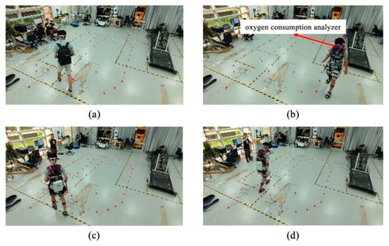 Verification experiments. (a) Subjects walked with a 10 kg backpack. (b) The exoskeleton only passively assisted the subject. (c) The exoskeleton actively assisted the subject during the 9–60% gait cycle phase. (d) The exoskeleton actively assisted the subject during the whole gait cycle. Subjects were asked to walk along the pink markers on the ground at self-selected speeds.