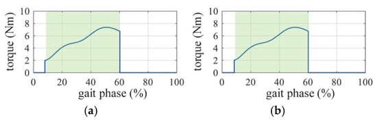 The active assistance timing of the hip exoskeleton in the setting shown in Figure 8c. (a) Left side. (b) Right side. This is an example from subject 8 during the tenth cycle in the partially active setting. The green rectangles are the active assistance phase planned by the controller. The blue lines are the real active assistance torques executed by the hip exoskeleton.
