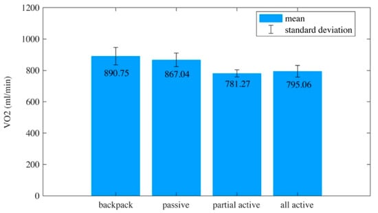 A mean ± std histogram of VO2. The quadratic fit of VO2 computed that the minimum VO2 was achieved with 9.89% reduction from the passive assist mode in the 9–60% active assistance phase.