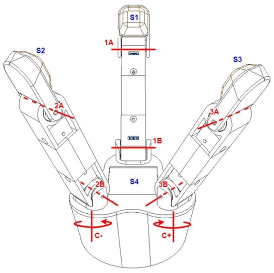 Diagram of the 3-finger robotic gripper kinematic structure. The central finger (S1) operates with two revolute joints (1A and 1B), allowing it to move similarly to a 2-joint planar articulated robot. The outer fingers (S2 and S3) also feature two revolute joints each (2A, 2B and 3A, 3B), along with additional joints (C+ and C−) that allow rotation around their base.