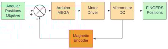 A control circuit was implemented in the motors of the joints of each finger to control the grip, which takes advantage of the hall effect sensors to measure the angular position of the joint axis. The motor speed values were regulated through a PID control, which, through the Arduino, stops or compensates the energy received by the motor until a specific angular position is reached. The block diagram of the process can be seen in Figure 7. The PID control parameters implemented in the system (, , ) were obtained using the Ziegler Nichols method. Due to the nature of the gripper’s functions, no overshooting was desired in the system. Therefore, the value of the ultimate gain and the oscillation period of the system was determined by increasing and bringing the and values to zero. The values of the remaining profits were determined using the Ziegler Nichols equations. Since the system varied the state of the motors through electronic drivers that controlled the speed, the system gains are based on a PD control to determine , and then through the iterative manual method, the value of is determined. The resulting values are : 1.5, : 0.005 and : 0.24375.