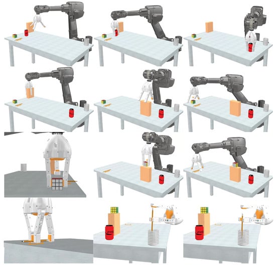 A prototype of the proposed solution was implemented, with the specifications in Table 1, after a simulation of its integration was carried out, with an ABB brand robotic arm of the IRB 2600 type (12 kg payload, and 1.65 m height). Figure 9 provides screenshots of the simulation carried out, where various objects are manipulated, validating the three types of grips allowed by the design. For the following figures presented, emphasis is placed on the three grip configurations previously proposed and their interaction with objects. In Figure 9 left column, the gripper can be seen in an open position, highlighting its ability to adapt to objects of various sizes.