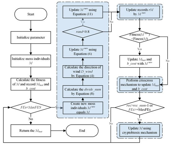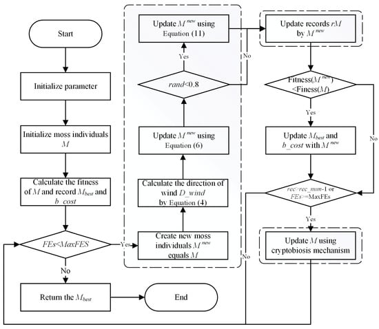 In summary, MGO starts by randomly generating a set of initial individuals, and during each iteration, it first determines the evolutionary direction of the population based on the wind direction, after which it performs spore dispersal search and dual propagation search sequentially based on the given probability and updates each individual through the cryptobiosis mechanism. This process is repeated until the maximum number of evaluations is reached and the optimal individual of the current population is returned. The flowchart of MGO is shown in Figure 1.