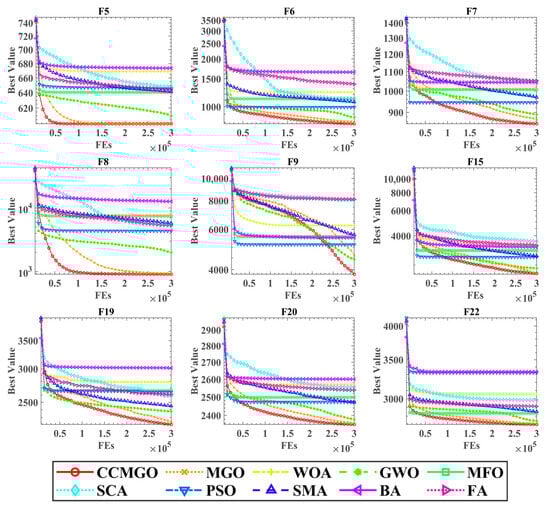 Convergence curves of the CCMGO on benchmarks with other algorithms.