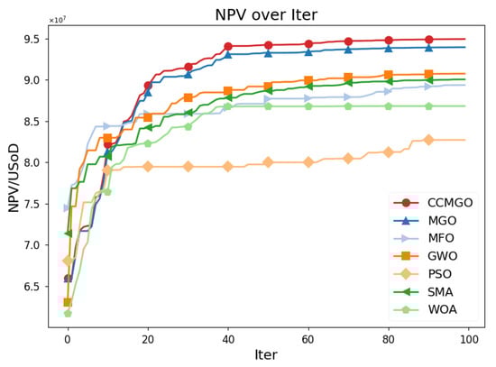 Figure 4 shows the NPV progression of CCMGO and six other algorithms over 100 iterations, with the horizontal axis representing the iteration count and the vertical axis showing the corresponding NPV values.