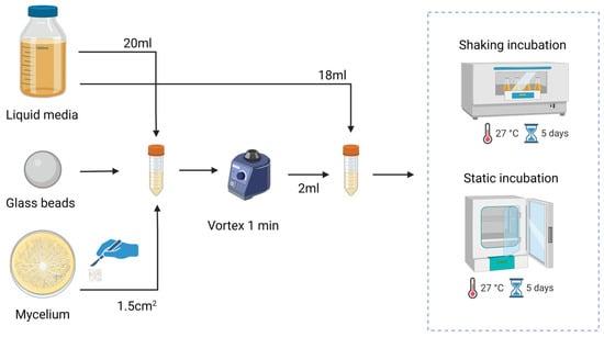 To create the liquid spawn, seen in Figure 1, a mycelium section of 1.5 cm2 was transferred from the agar plate to a falcon tube containing glass beads and 20 mL of liquid media. To ensure thorough homogenization of the mycelium, the falcon tube was vortexed. From the homogenized mycelium, 2 mL was transferred to a new falcon tube containing 18 mL of the according medium and placed at 27 °C in a static or shaking incubator for a period of 5 days.