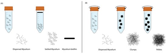 The growth mechanics of mycelium during liquid state fermentation in (A) static and (B) shaking incubation.